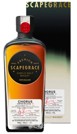 Способ производства: scapegrace Chorus это односолодовый виски ограниченного выпуска. Он производится из новозеландского ячменя сорта Laureate, и выдерживается в бочках из девственного французского дуба в течение 3-х лет. Было произведено 7824 бутылки, без холодной фильтрации и добавления карамели.